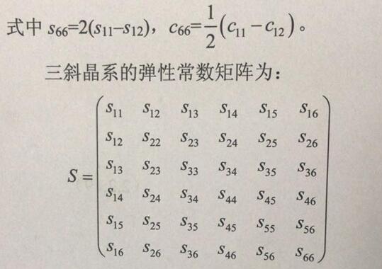 晶体的弹性常数反映晶体的弹性性质。从这些弹性常数矩阵看出,用双足标表示的弹性常数共有36个分量。三斜晶系是完全各向异性体,对称性最低,36个不等于零的弹性常数分量中,独立的分量有21个。而石英晶体的独立弹性常数分量为6个。
