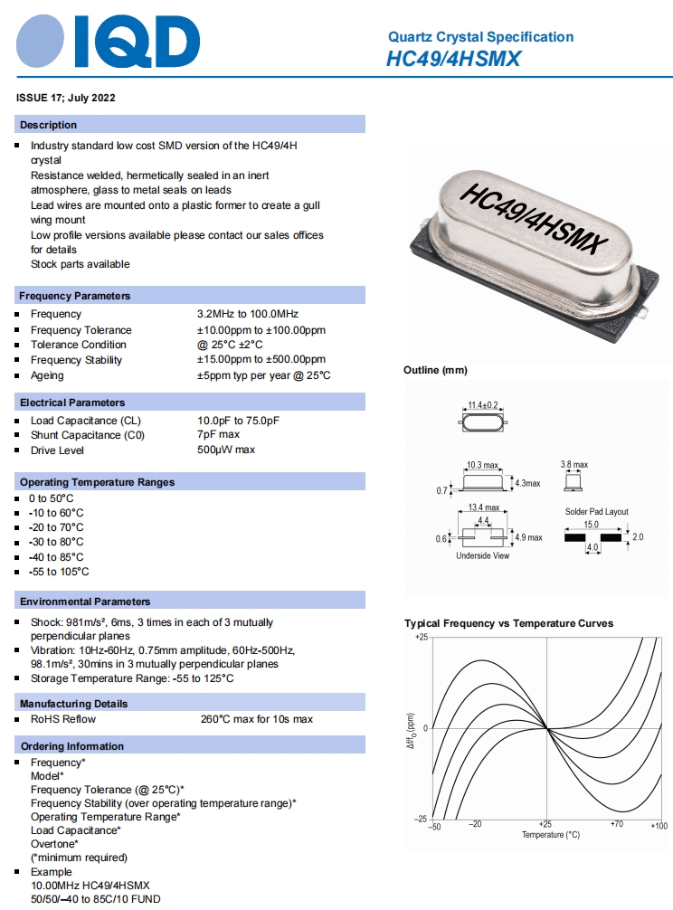 英国IQD晶振|HC49/4HSMX|LFXTAL081958Reel|SMD晶振规格表