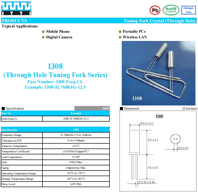 ITTI晶振,I308圆柱32.768K晶振,I308-32.768KHz-12.5插件晶振,I308系列圆柱32.768K晶振最适合用于比较低端的电子产品,比如儿童玩具,普通家用电器,即使在汽车电子领域中也能使产品高可靠性的使用.并且可用于安全控制装置的CPU时钟信号发生源部分,好比时钟单片机上的石英晶振,在极端严酷的环境条件下,晶振也能正常工作,具有稳定的起振特性,高耐热性,耐热循环性和耐振性等的高可靠性能,由于在49/S形晶体谐振器的底部装了树脂底座,就可作为产品电气特性和高可靠性无受损的表面贴片型晶体谐振器使用,满足无铅焊接的回流温度曲线要求.