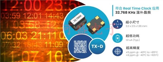 TX-D 的超小尺寸 3.2 x 2.5 x 1.36 mm,非常适合空间受限的应用,提供高稳定性的 32.768kHz CMOS 输出,是一款