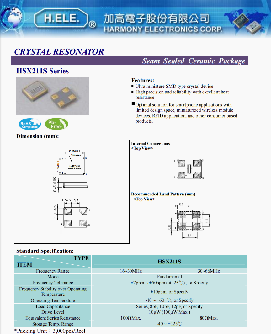 | 频率容差 | ±7ppm ~ ±50ppm (at. 25℃) , or Specify |